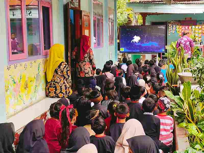 Peserta didik SD Negeri 4 Sumberanyar menonton risalah tentang Isra' Mi'raj mengenang saat Nabi Muhammad melaksanakan Isra' Mi'raj